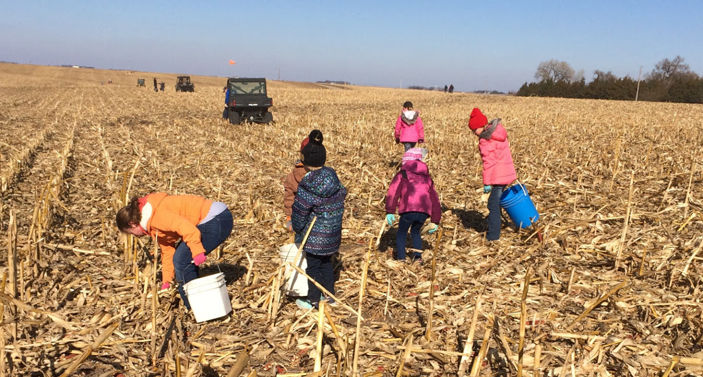 The Holy Family students and faculty visited a local farm field on November 15. We were volunteering to help pick up ears of corn that had fallen off corn stalks before being harvested. Just doing our part to try to not waste God’s bounty, get some fresh air, and possibly raise some funds while we were at it. A local feed lot purchased the ear corn to be ground into cattle feed. Local farmers volunteered their time and equipment to help gather and haul the ear corn. We worked in sunny 50 degree weather with a brisk wind.