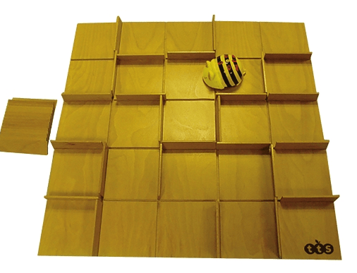 Blue Bots and their changable maze. Build your own maze and use simple coding steps to have blue bot solve it.