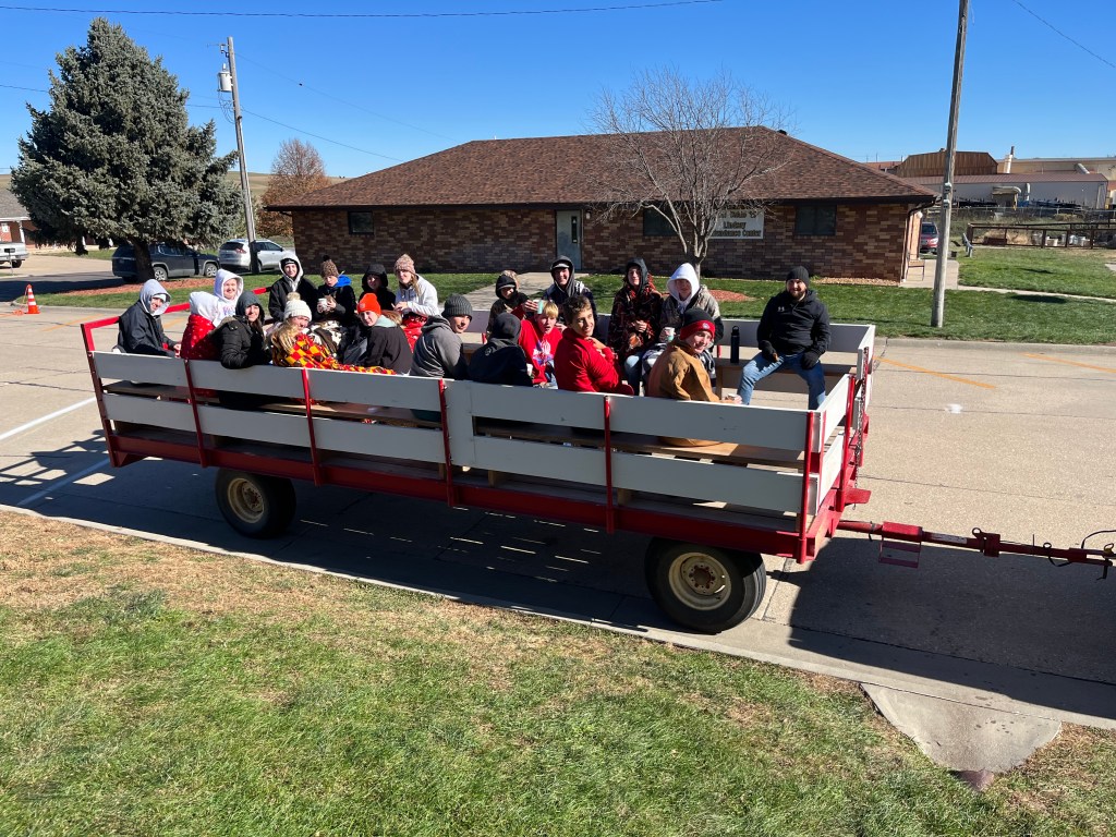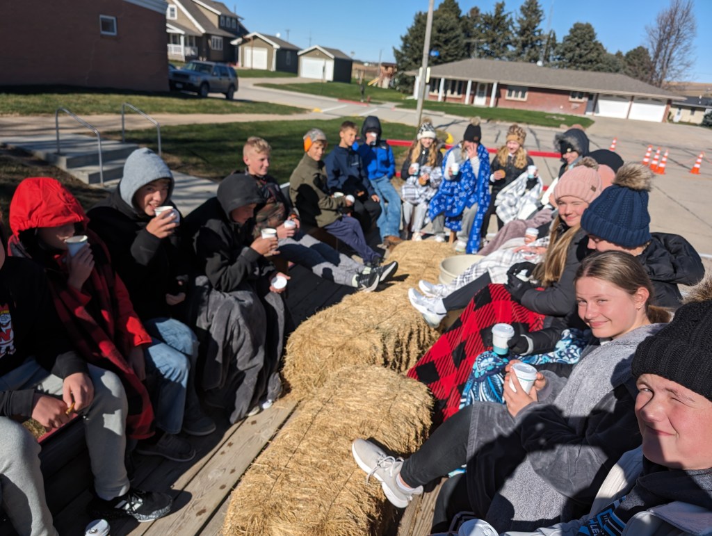 On Halloween, Lindsay Holy Family junior high and high school students had fun drinking hot coco & cider, eating cookies and popcorn and getting a hay rack ride and watching a Halloween movie.